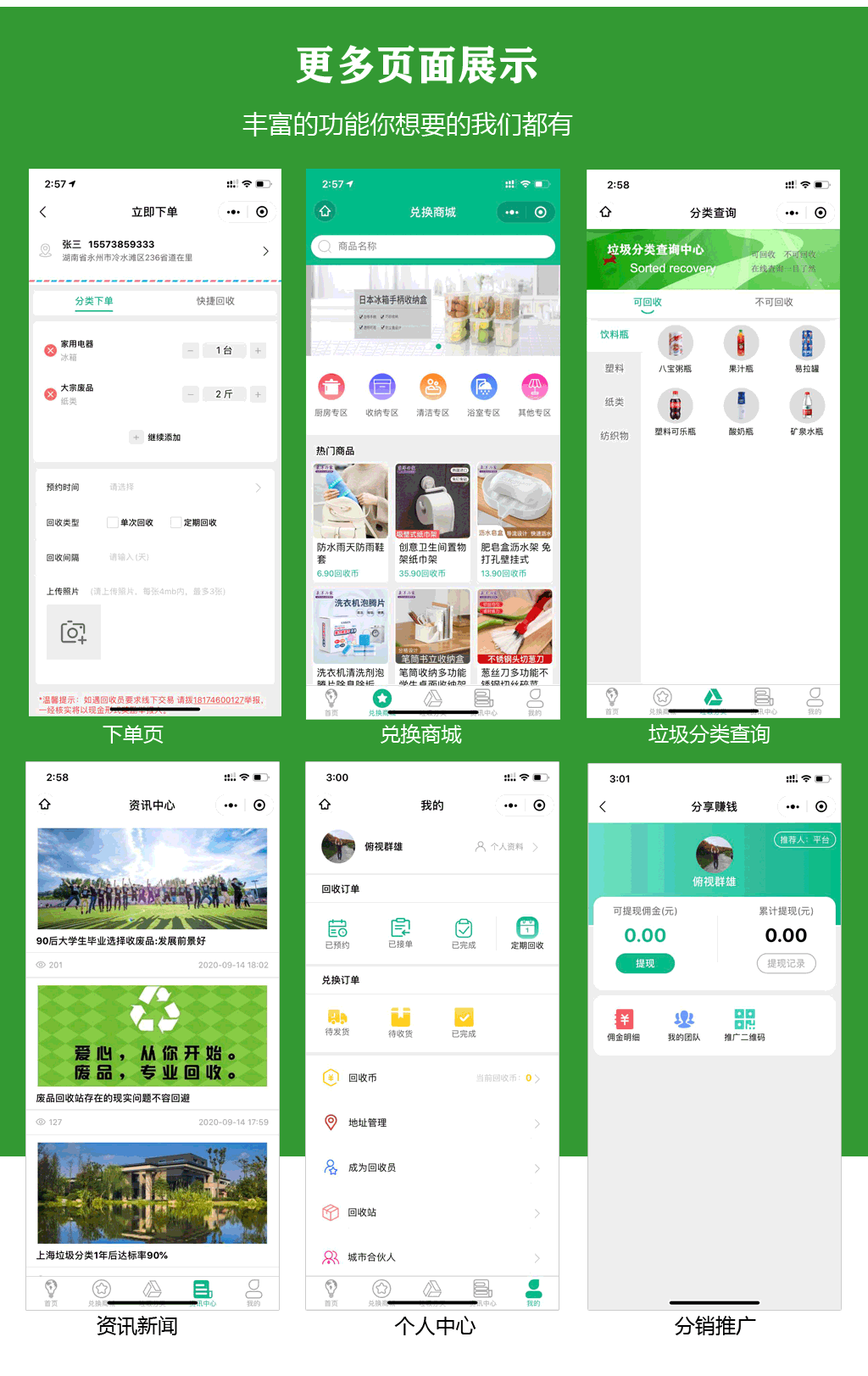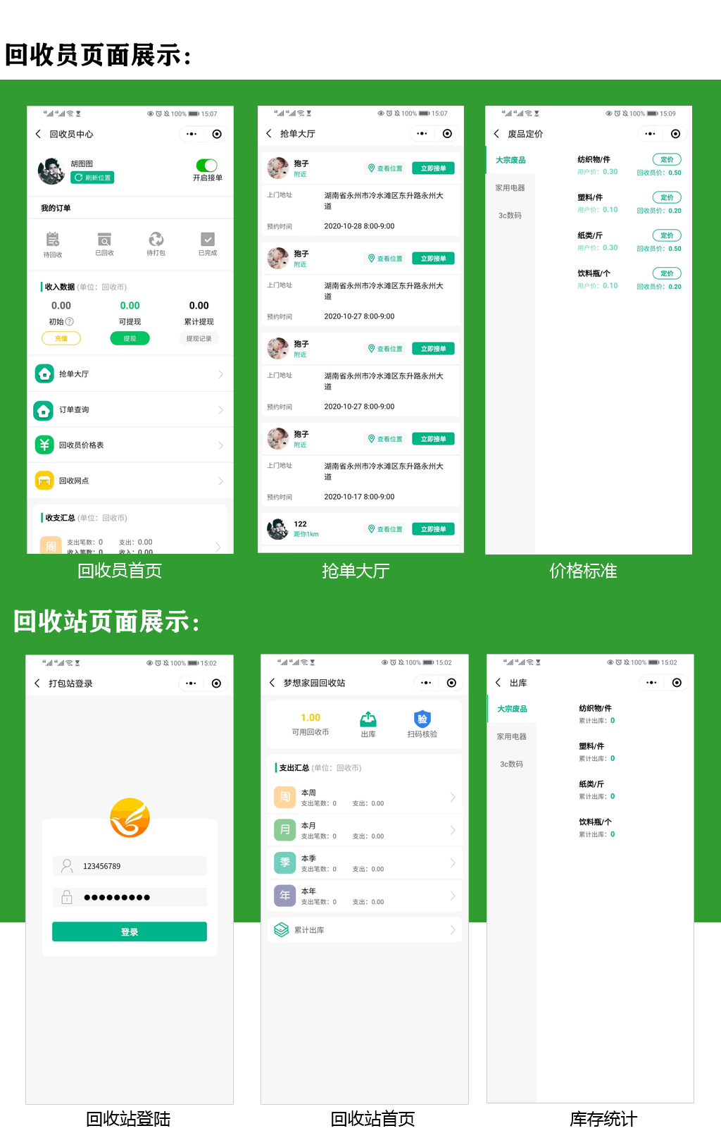 1、線上上門回收:不需要硬件設備,不需要建立投遞流程,全部上門回收,不需要環保回收袋,只是每次上門回收的時候,用戶掃碼綁定下訂單,回收后的數據由后臺進行錄入上傳,再反饋到用戶端數據展示及其他操作。