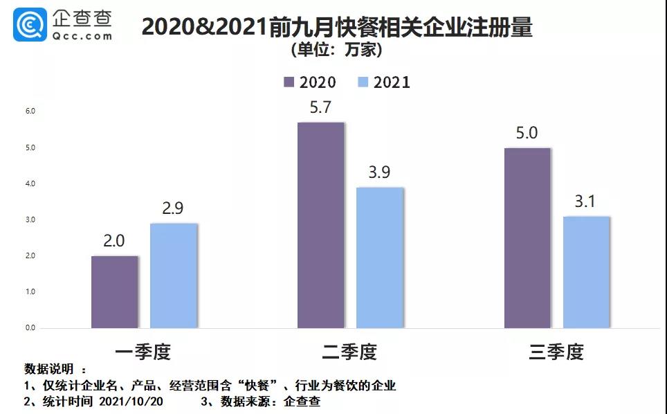 從今年的注冊量來看,2021年前九月,我國快餐相關(guān)企業(yè)注冊量為9.9萬家,同比下跌了22.0%。從各季度注冊量來看,今年一季度、二季度、三季度的注冊量分別是2.9萬家、3.9萬家、3.1萬家。