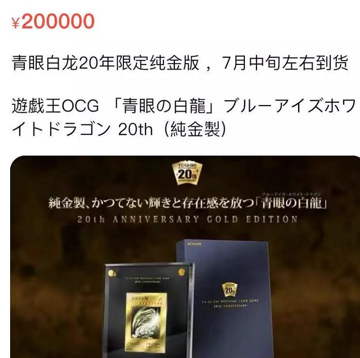 有業內人士表示,被拍賣的游戲卡牌是一張20周年紀念版“青眼白龍”游戲王純金卡牌,是由6KONAMI公司開發的集換式卡牌游戲《游戲王卡片游戲》中所使用到的游戲紙牌,限量發售500套,官方定價為1.2萬人民幣。據某二手交易平臺信息,目前該同款卡牌掛牌售價高達20萬人民幣。